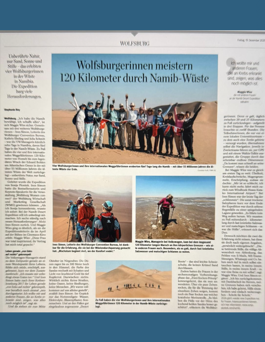 But here we go: In September 2023 Sonja organised the first all female expedition to conquer the Namib on foot: 17 women, 12 nationalities, 5 days of hiking, 120 kilometres!!!
